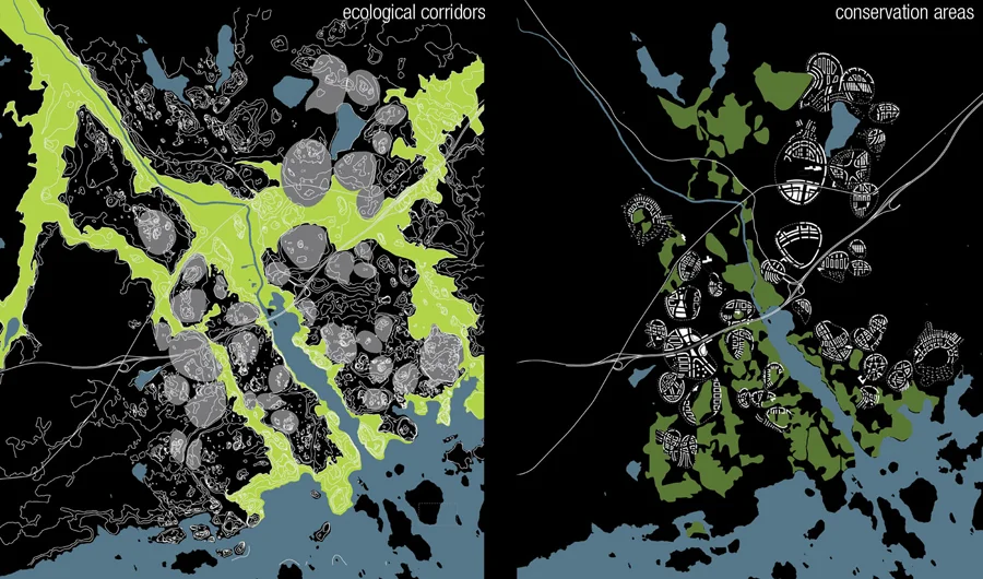 Sibbesorg: Urban Archipelago. This is an urban design for Sibbesborg, a community one hour by car to the east of Helsinki. The mandate of the design is to plan for Sibbesborg’s growth from a community of 3,000 to a city of 100,000 people. Our proposition, the Sibbesborg Archipelago, is a network of neighborhoods, island-like in form, but bound together in a larger urban ensemble by shared networks of social and physical infrastructure. Set within the forested landscape, amidst agricultural fields, wetlands, and coastline, these urban islands are linked but distinct neighbourhoods that leave intact existing landscapes and permit, in the space between them, the constitution of a new ecological and recreational network that is as vital to the metropolitan form as the islands of the archipelago themselves. The islands are connected by roads, bike paths, parks, and the shared social and economic institutions of schools, commerce and shopping, and linked to the larger territory by regional transportation and new concentrations of employment and retail services. Between these islands continuous ecological networks of habitat, hydrology, and farmland are preserved, shaped, and stitched into a larger territorial ecology. New and re-purposed networks of biking, walking, and hiking paths turn the natural amenities of the Sibbesborg region into an attractive destination for recreation and tourism.